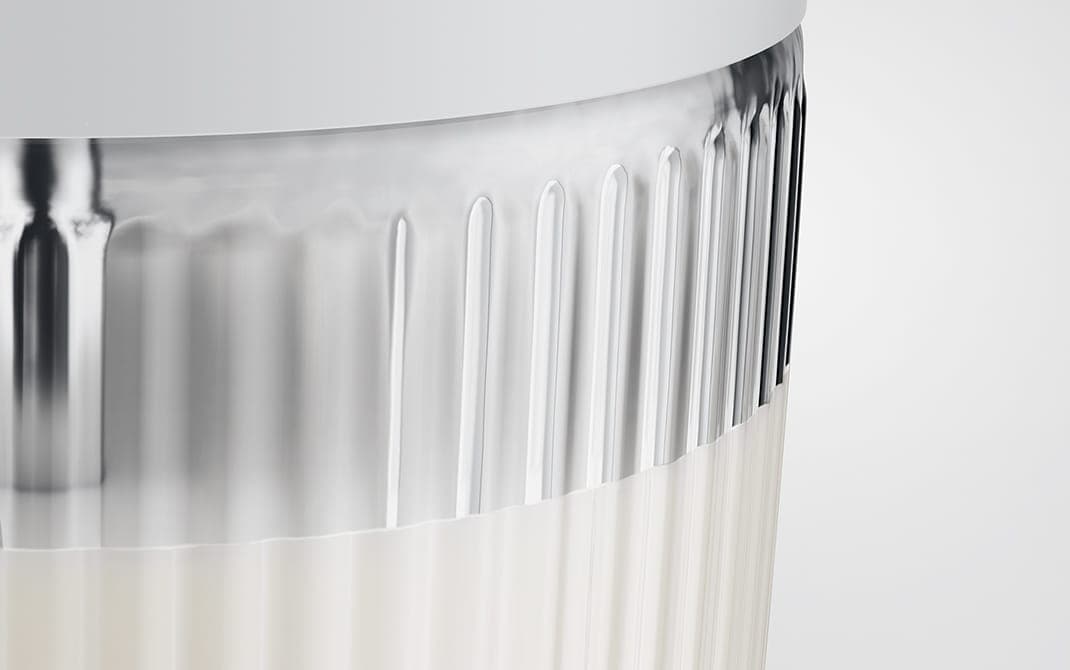 Feita em vidro borossilicato, a leiteira é resistente a riscos e a variações de temperatura. Adequada para uma lavagem higiénica na máquina de lavar louça, protege o leite e as bebidas alternativas ao leite de odores e mantém-nos frescos. A base espessa mantém a leiteira estável e, em conjunto com a estrutura ranhurada da superfície, cria um aspeto particularmente elegante.