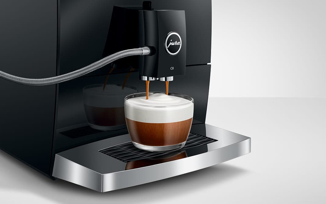 A espuma de leite fina inaugura o prazer do Latte macchiato e completa o deleite do Cappuccino. Ambos os clássicos com espuma de leite são preparados na hora pela C8 com um simples toque de botão e numa qualidade irrepreensível. A leveza da espuma de leite deve-se à tecnologia de espuma fina, na qual o leite é agitado duplamente em câmaras separadas, criando assim uma espuma de leite com um caráter especial.