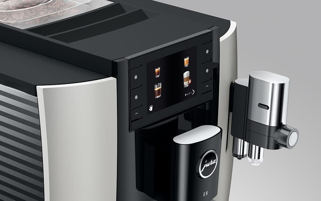 O design característico das máquinas de café automáticas da JURA revela-se claro e expressivo. Os materiais de alta qualidade e o processamento preciso sublinham a qualidade Premium da E8 moderna. As suas formas representam desde logo qualidade, funcionalidade e durabilidade. Os detalhes, nomeadamente o depósito de água com design canelado ou a base cromada para chávenas de alta qualidade, completam o design claro e harmonioso da E8.