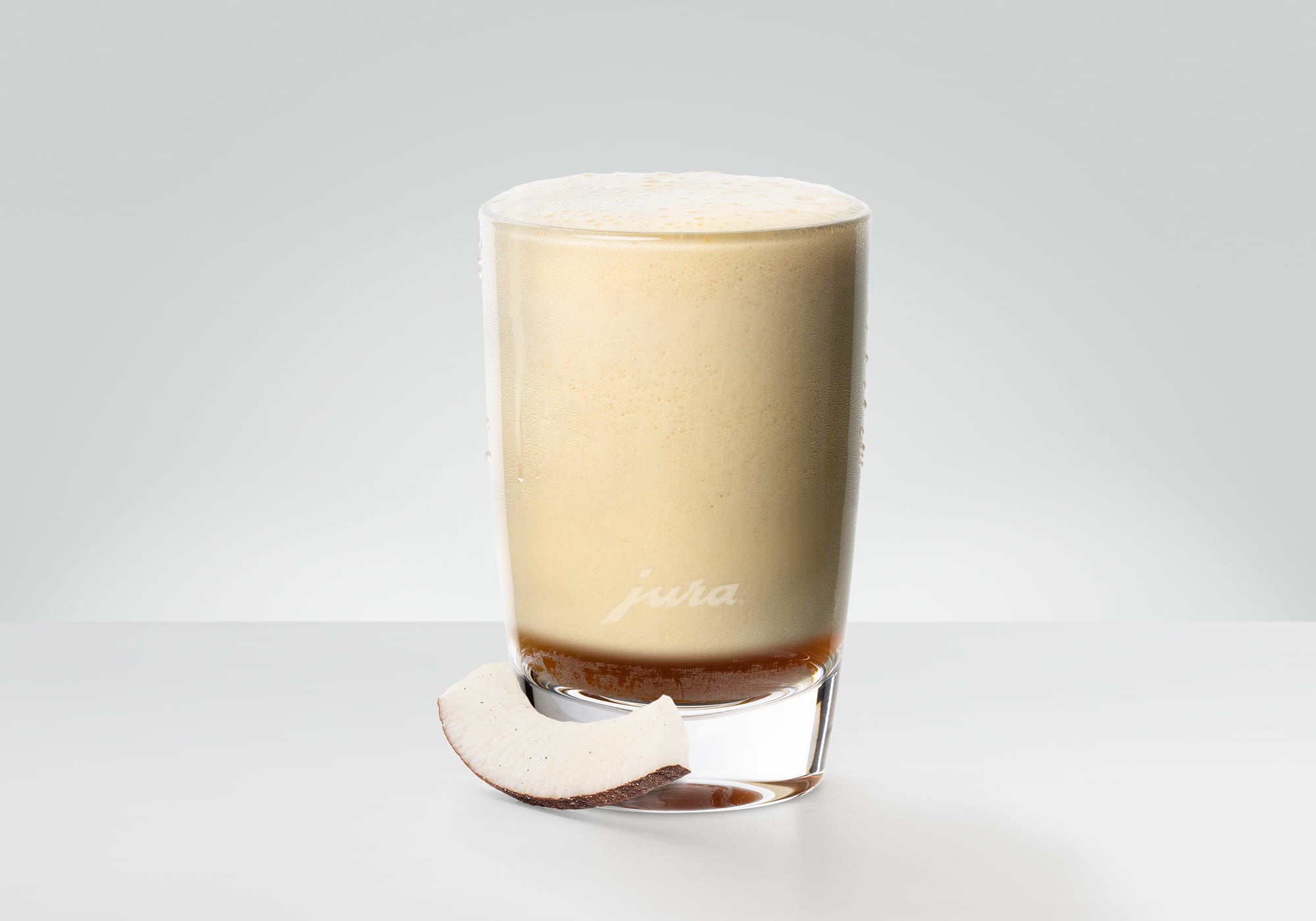 • Verta agora a especialidade de café para um copo pequeno de Latte macchiato, juntamente com os restantes cubos de gelo.